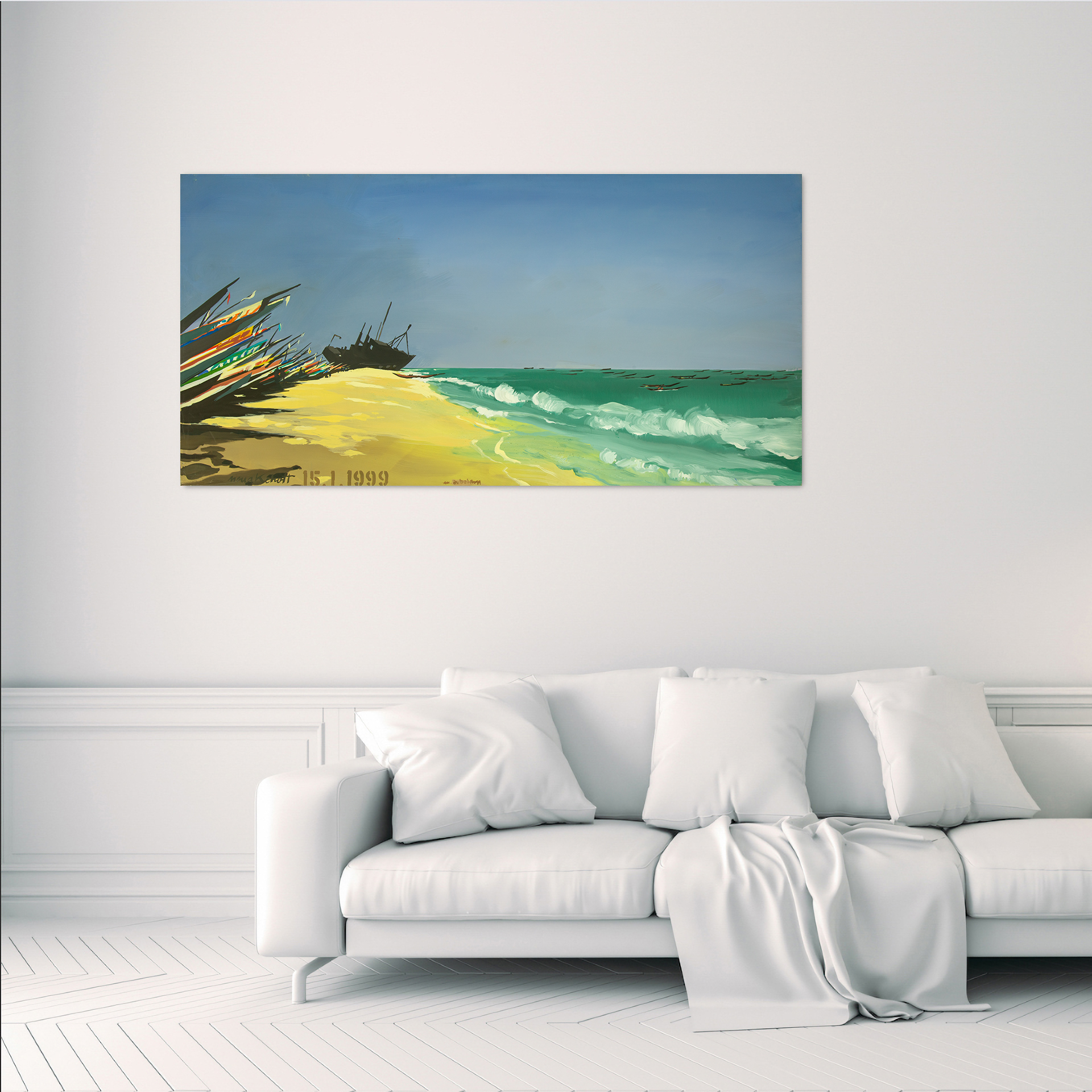 Peinture « historique » réalisée in situ sur la plage de Nouakchott, le 15 janvier 1999 à l’occasion de la quatorzième étape du Grenade/Dakar – 16 peintures en 16 étapes, à l’invitation d’Hubert AURIOL. Mise à prix : 2 800 € avec prix de réserve Montage sur châssis bois, date du jour de la peinture au pochoir en bas à gauche suivi du titre de l’étape, signature en bas au centre. La peinture se retourne sur les bords. La toile est agrafée à l’arrière du châssis (agrafes invisibles). Le visuel N°2 montre une mise en situation de la peinture. Le visuel N°3 est une capture d’écran qui montre Michelle AUBOIRON interviewée par Pascal Sanchez en direct sur France TV le 7 janvier 1999, sur la plage de Dakar, pendant qu’elle réalise la 16ème et dernière peinture de la série. Peinture visible en atelier sur rendez-vous à Paris 20è (06 62 77 26 03) jusqu’à la veille de la clôture de la vente. Pour en savoir plus sur la série Le « DAKAR » 99 : https://auboiron.com/series-de-peintures/peintures-d-afrique-sur-le-paris-dakar/