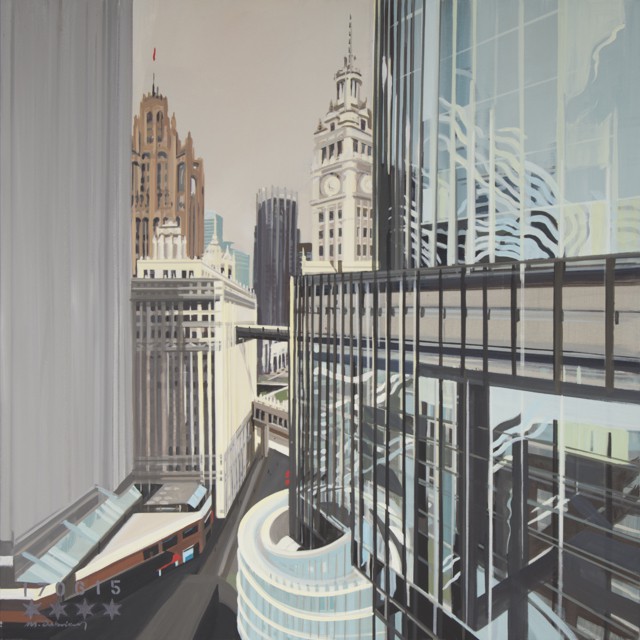Chicago Express – N°23 : Wrigley Building and Tribune Tower from IBM Building / de Chicago, Les peintures / Par Charles GUY N°23 : Wrigley Building and Tribune Tower from IBM Building- Acrylique sur toile – 120 x 120 cm ← Article précédentArticle suivant →