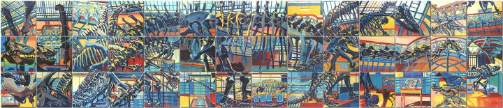 Avec l’aimable autorisation de Philippe Taquet, Directeur du Museum d’Histoire Naturelle du Jardin des plantes à Paris, j’ai pu installer mon chevalet pendant 6 mois dans la grande galerie de paléontologie. De cet enchevêtrement de squelettes, vieux de 170 millions d’années, et d’architecture en métal du XIXème siècle, a émergé le « Diplonosaure », sorte de chimère révélée par la juxtaposition des 42 fragments observés à la manière des « carrés de fouille » des paléontologues. La toile reconstitue le Diplodocus en vraie grandeur en un ensemble de 21 m x 4,5 m.